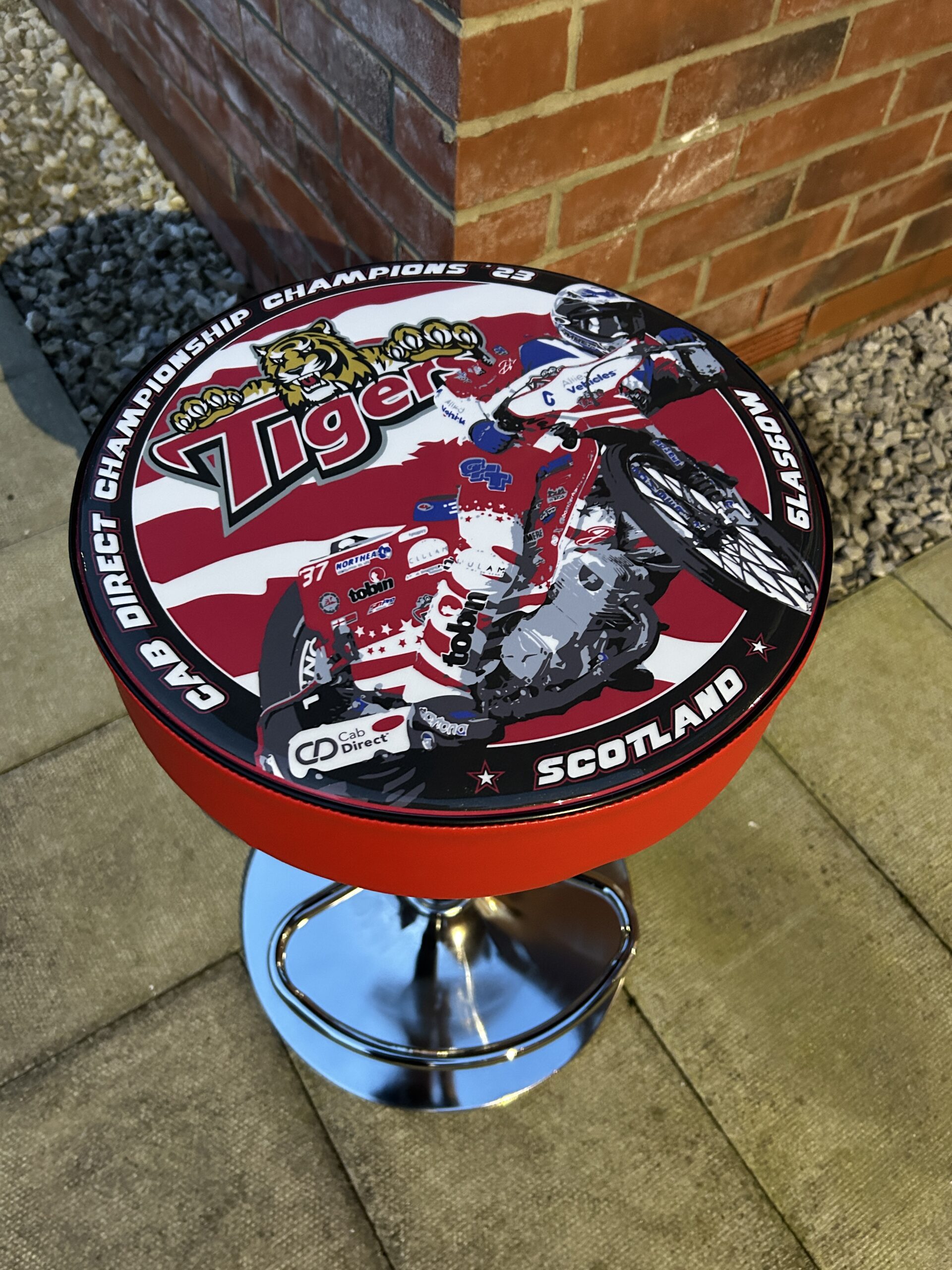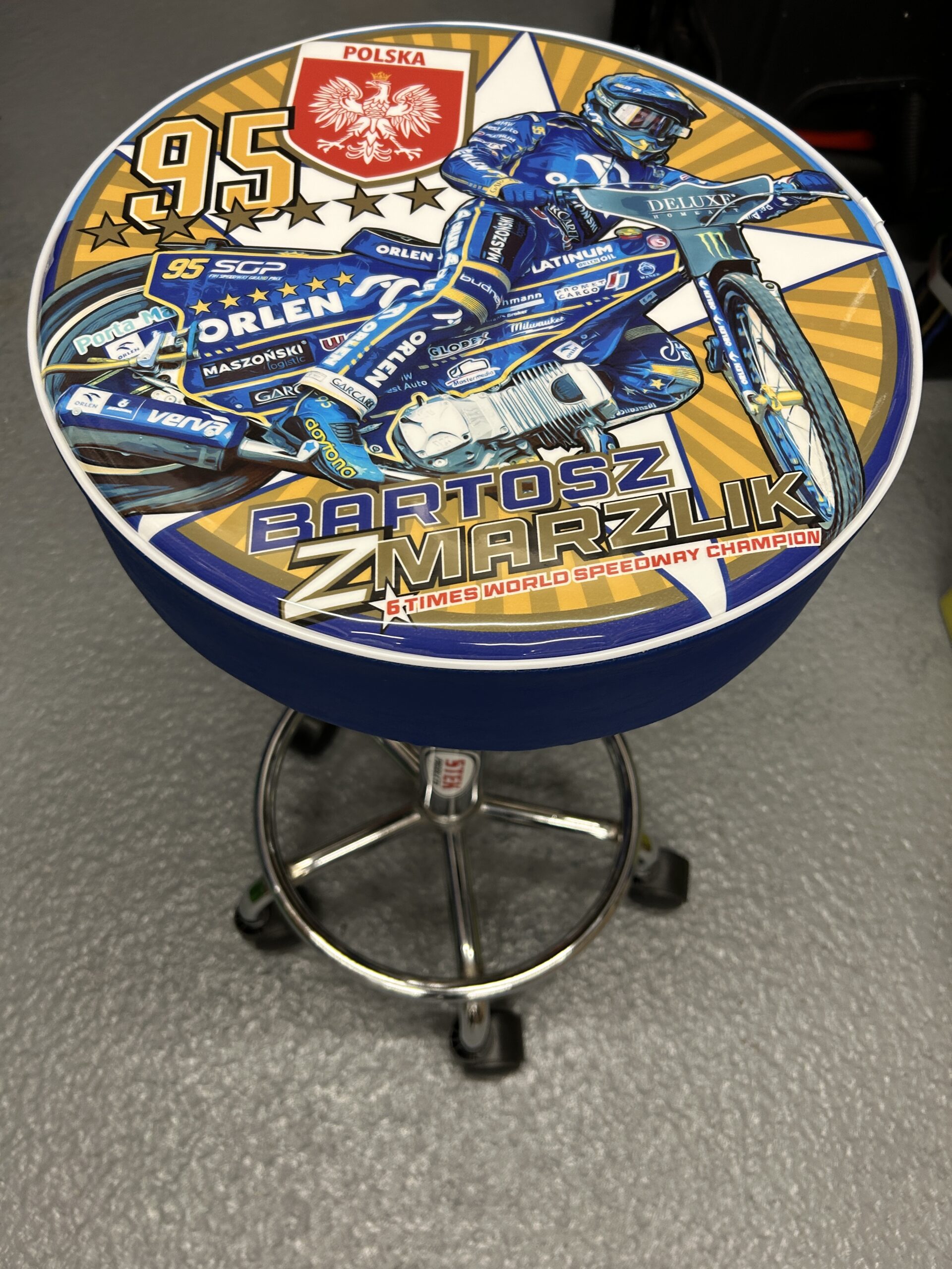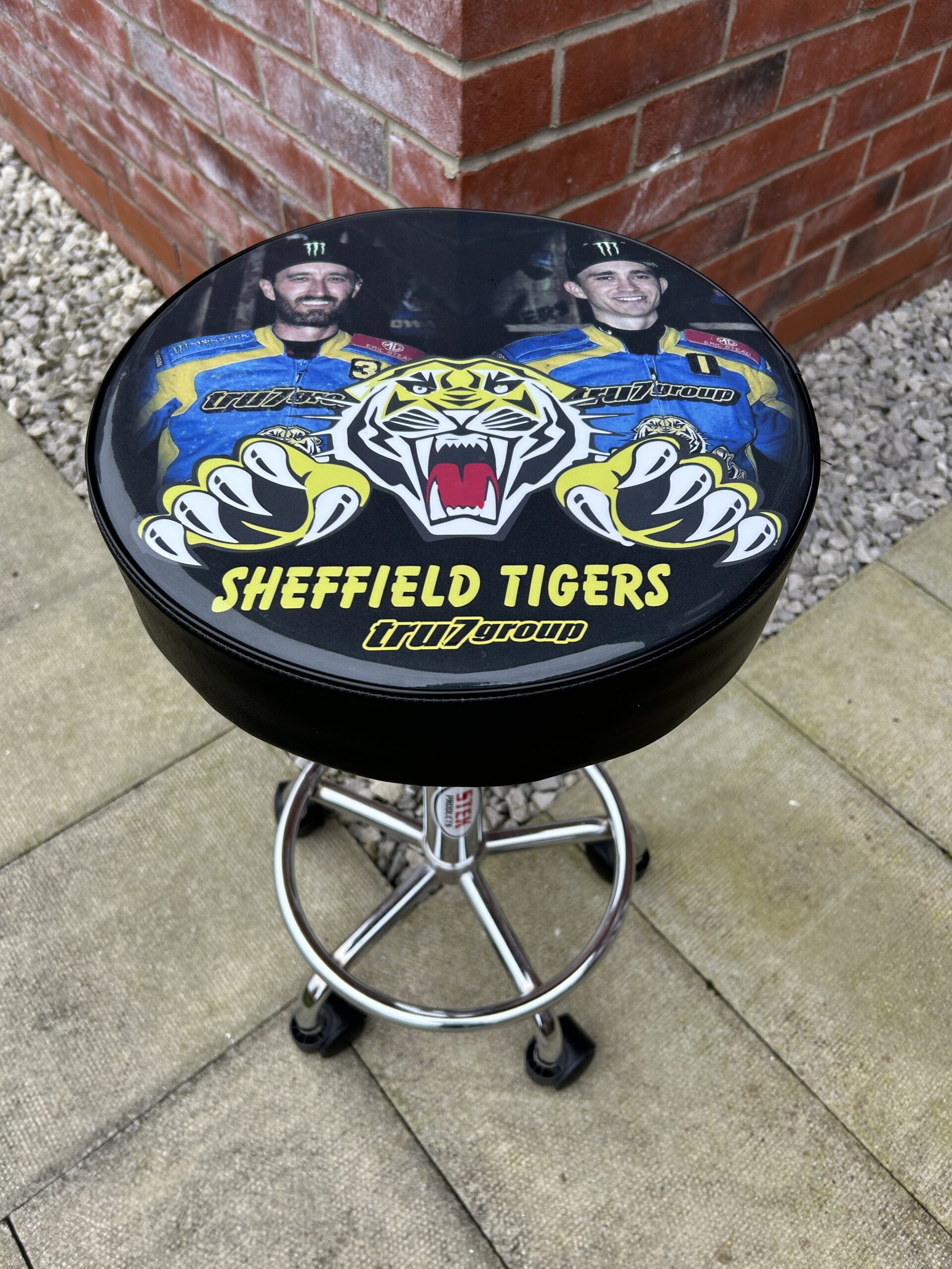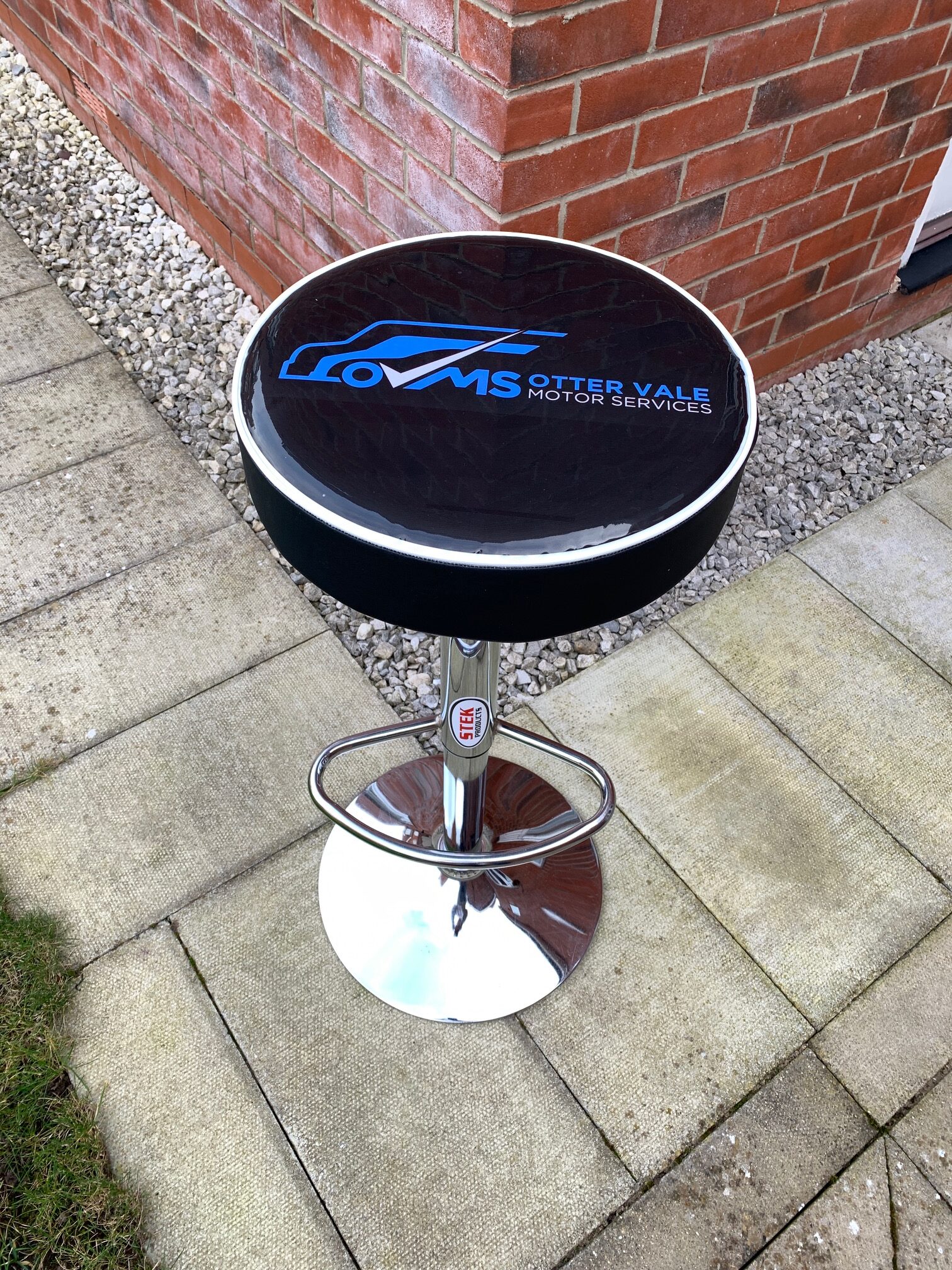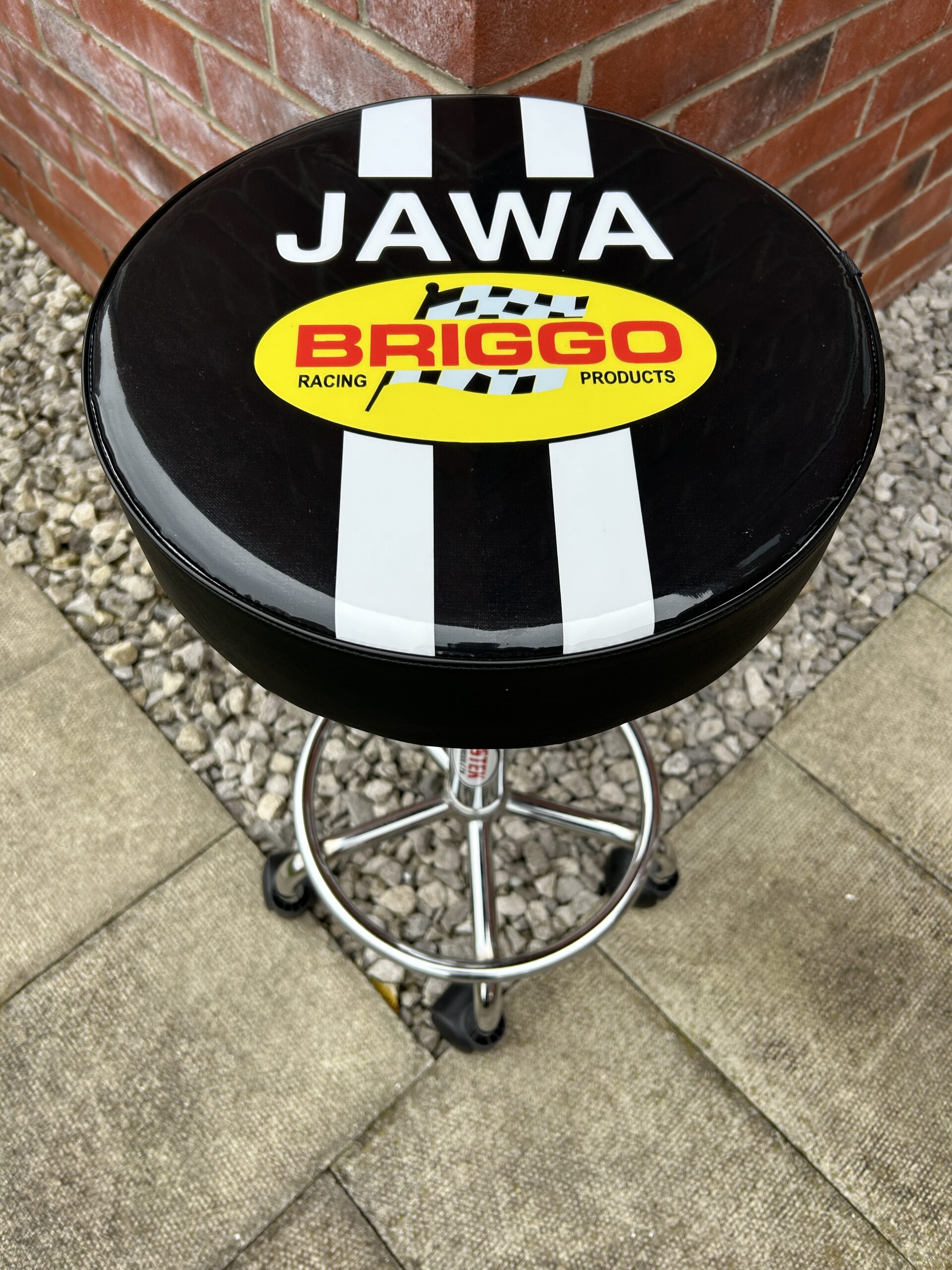 Your design brief goes on the seat base of a rolling workshop stool, which has a swivel top and is height adjustable.