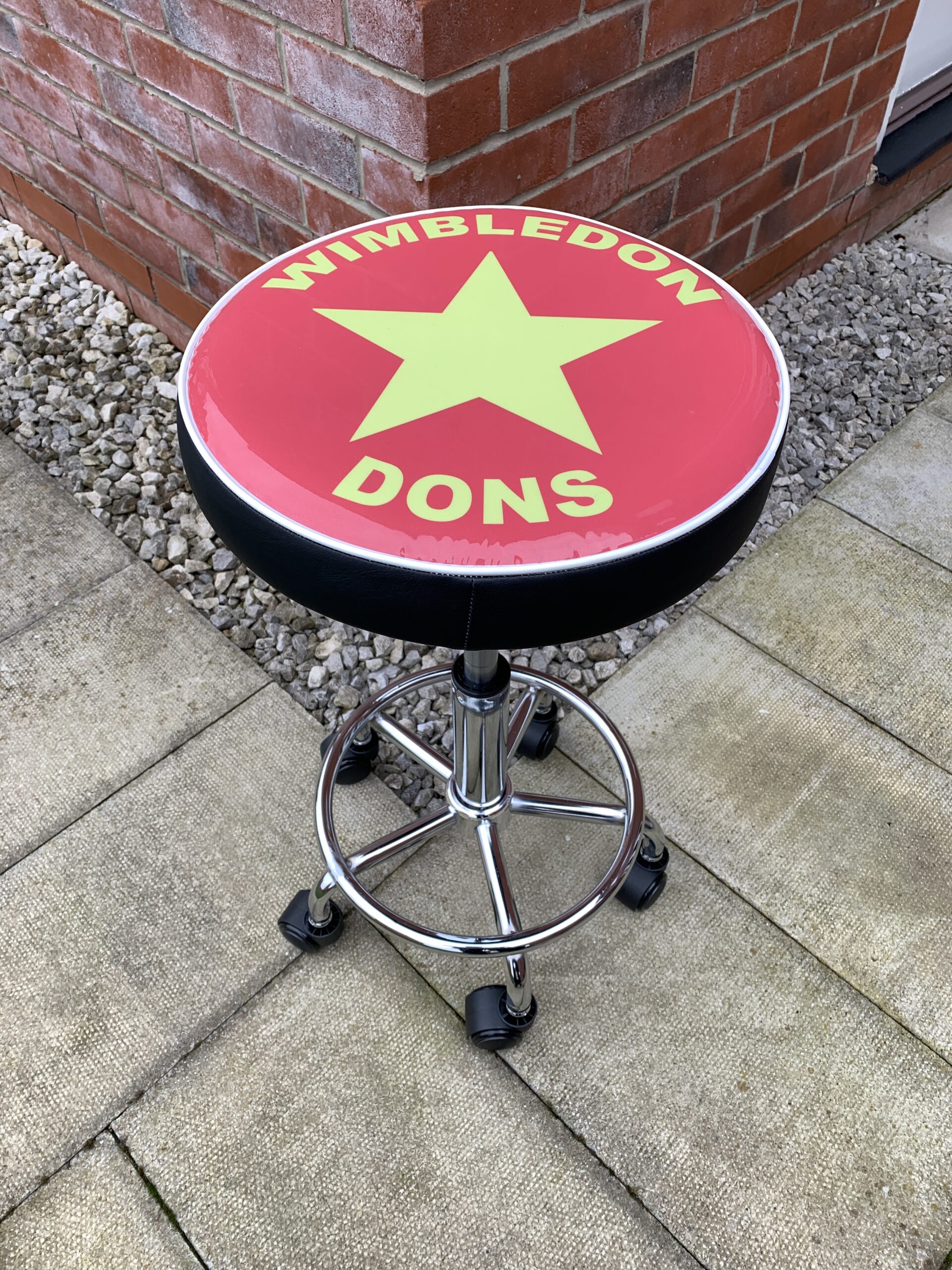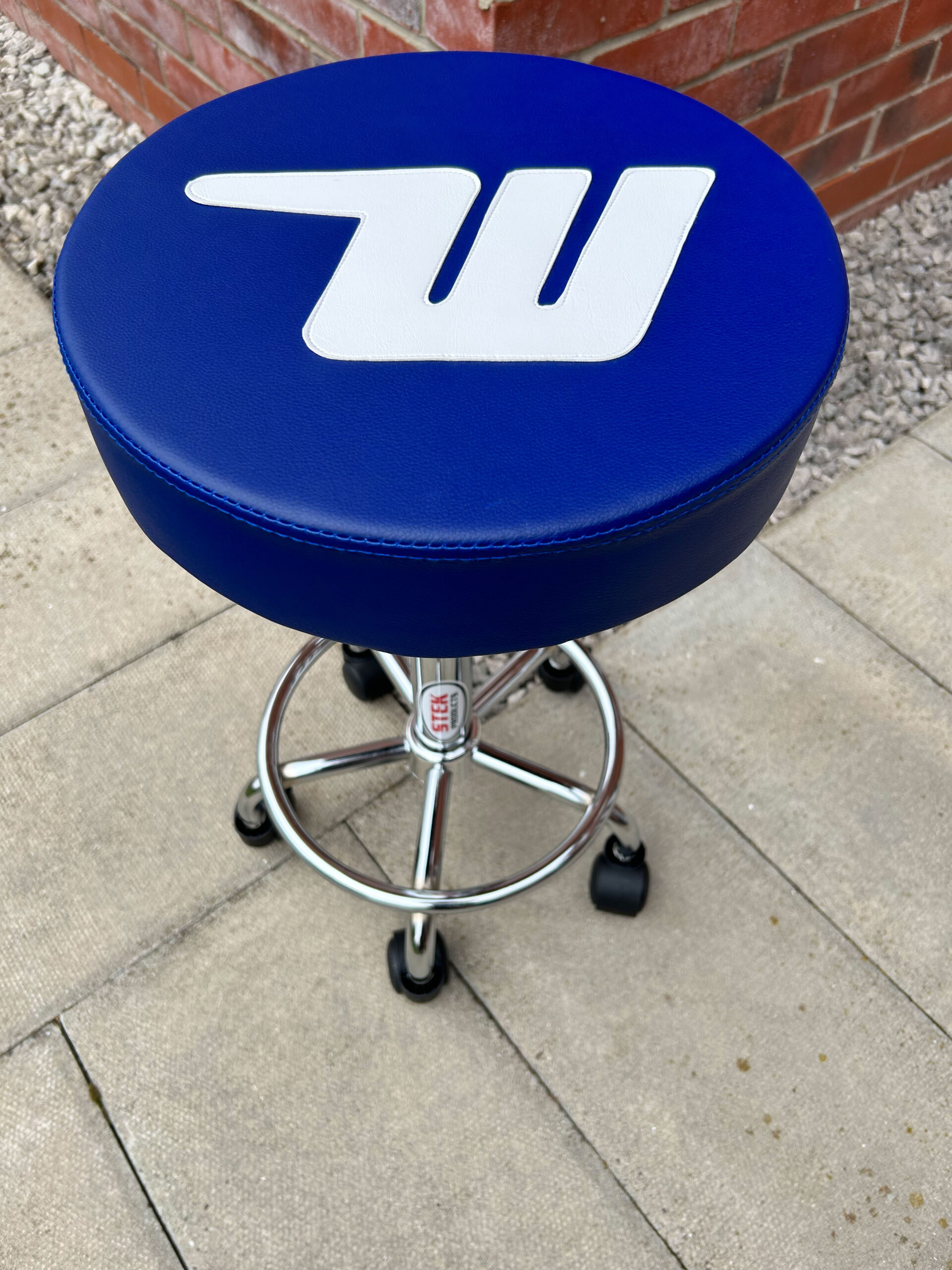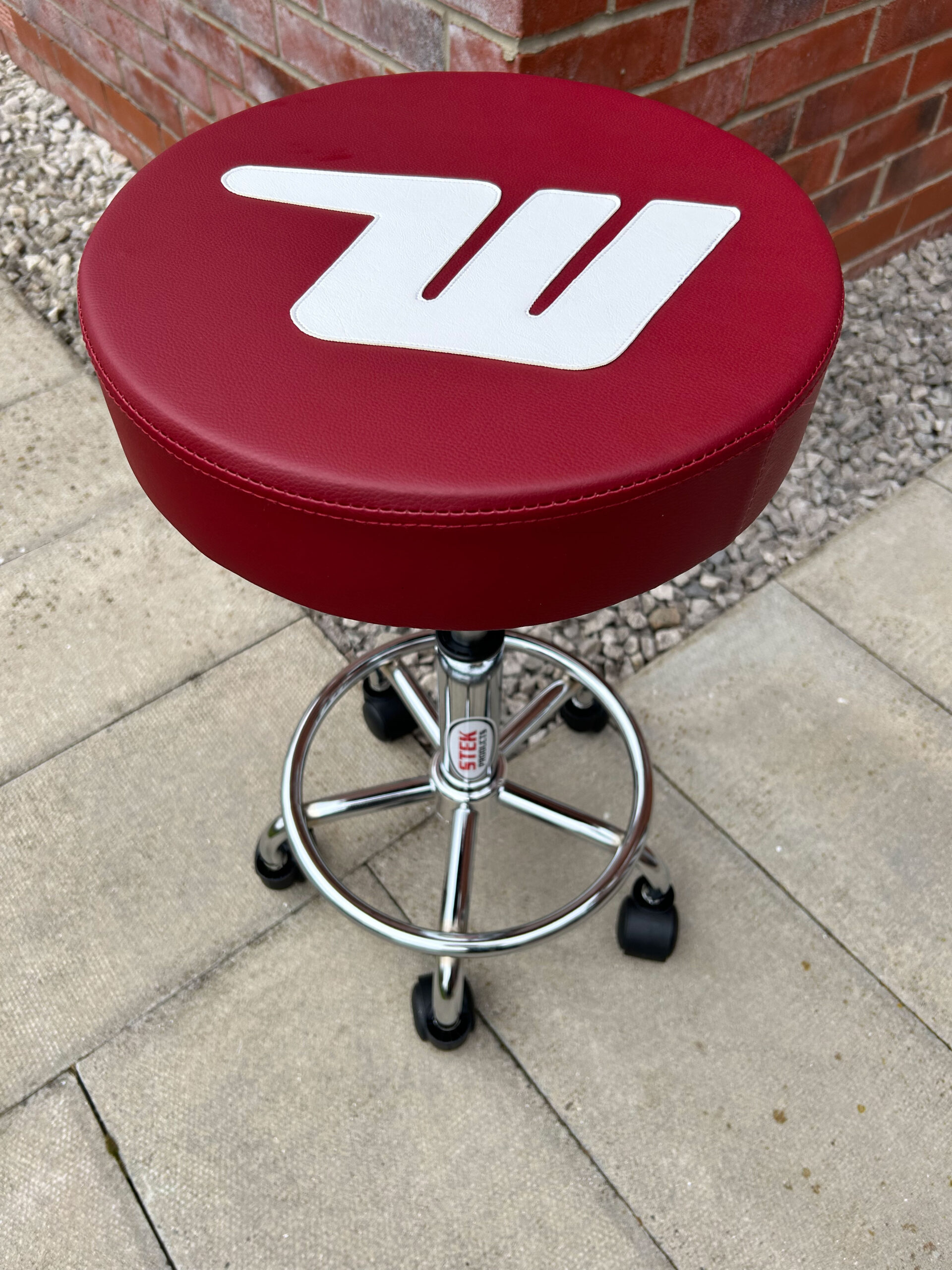 Your design brief goes on the seat base of a rolling workshop stool, which has a swivel top and is height adjustable. - Stools are also available as Breakfast Bar Stools and will look great in your bar or the kitchen at home.